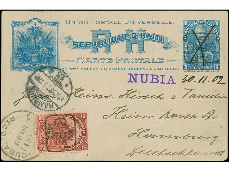 “NUBIA” violetter L1 mit handschriftlichem Datum “30.11.02” auf Handstempel-Aufdruck-Ganzsachenkarte 1 C. mit Zufrankatur Ausgabe 1902 2 C. und Text nach Hamburg mit Ankunftsstempel, in guter Erhaltung