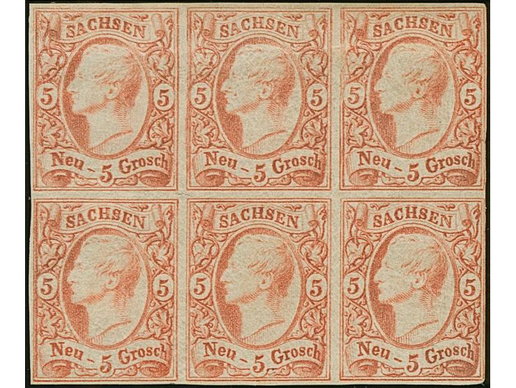 5 Ngr. ziegelrot (orangerot Nuance aus einer frühen Auflage), waagerechter 6er-Block, rechts leicht berührt, sonst voll- bis breitrandig, ungebraucht mit Originalgummi. Schöne und einwandfreie Erhaltung. (zwei im Attest erwähnte "Gummiabriebstellen" sind auch unter VSC nicht feststellbar). Fotoattest Vaatz BPP (2025)