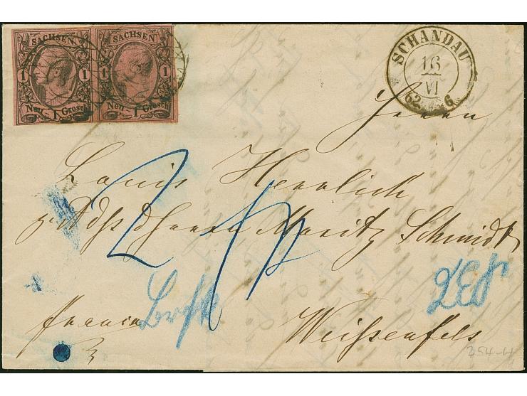 1 Ngr. auf mattgraurot (dunkel Nuance) im waagerechten Paar, unten berührt, sonst voll- bis breitrandig, teils leicht verfärbt, mit Nr. "81" und sauber nebengesetztem Doppelkreisstempel SCHANDAU 16/VI 62 auf Faltbrief nach Weißenfels in Preußen. Die Entfernung zwischen den Orten fiel in den 3.Rayon, daher neben dem handschriftlichem "franco" - Vermerk blauer Vermerk "Bfkst." (Briefkasten) angebracht und der Brief mit "2" Silbergroschen nachtaxiert. Fotoattest Vaatz BPP (2025)