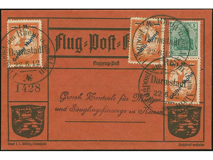 Rhein/Main: 1912, Gelber Hund 1 M., drei Einzelwerte und Germania 5 Pfg. je mit Flugstempel “Darmstadt 22.6.12” auf sogenannter “Roter Hund”-Karte. Die Karte oben mit kleinen Randbügen, ansonsten in einwandfreier Erhaltung (Sieger 13b)