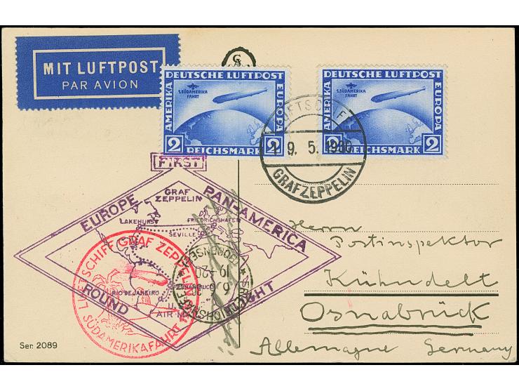 1930, SAF 2 M. mit liegendem Wasserzeichen mit Bordpoststempel vom 19.5.1930 auf Karte zur Südamerikafahrt mit e. Unterschrift K. Schönherr sowie deutschen und amerikanischen Bestätigungsstempel nach Osnabrück, in einwandfreier Erhaltung (Sieger 57 H)