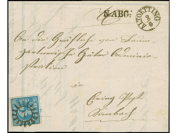 3 Kreuzer blau mit roter Gummierung von Altötting, farbfrisch und allseits breitrandig, mit klar aufgesetztem gMR "7" auf Faltbrief mit nebengesetztem Fingerhutstempel "ALTOETTING 2/6" (1851) und "N.ABG:", nach Ering Post Simbach. Ein schöner und sehr seltener Brief; PROFI hat nur 2 weitere Briefe mit dieser Marke registriert. Fotoattest Brettl BPP (1990)