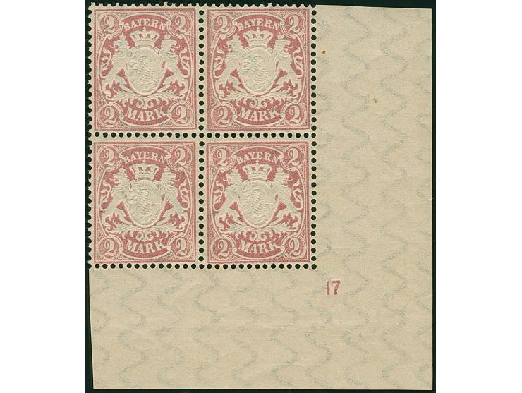 1890, unverausgabte 2 Mark mittelbräunlichlila, rechter unterer Eckrand-4er-Block mit Pl.-Nr. "17", postfrisch. Einwandfrei. Signiert 'Bay. St. Min. D. Fin.'. Fotoattest Dr. Helbig BPP (2012)