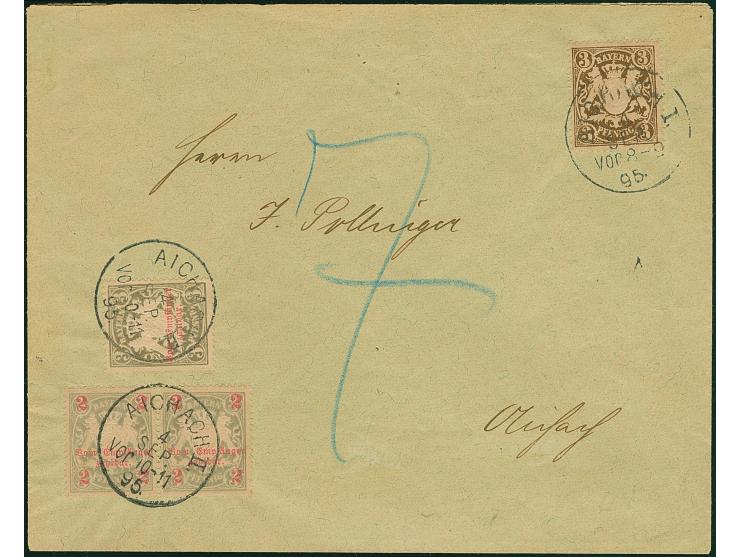 1895, das 'Aichach-Provisorium': 3 Pfennig grau mit Überdruck "2" in allen vier Ecken, waagerechtes Paar, farbfrisch und einwandfrei gezähnt, zusammen mit normaler Portomarke 3 Pfennig, als Nachfrankatur auf mit 3 Pfennig unterfrankiertem Ortsbrief des Postmeisters Pollinger von "AICHACH 4 SEP. 95". Dies ist der einzige noch intakte, ursprüngliche Brief mit dieser Marke. Eine der größten Kostbarkeiten der Deutschen Philatelie. Ausführliches Fotoattest Schmitt BPP.