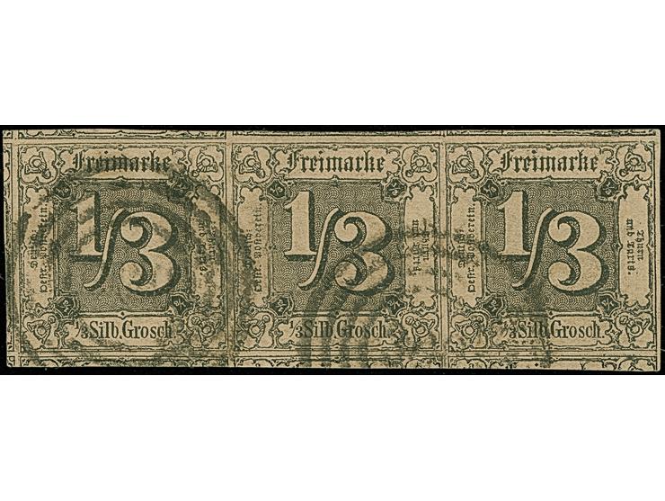 ⅓ Silbergroschen auf hellbraunocker, waagerechter 3er-Streifen, rechts breit- sonst allseits überrandig, mit Teilen von 9 Nachbarmarken, leicht entwertet durch Nummernstempel (wahrscheinlich "300" HAMBURG). Am Oberrand unauffällige waagerechte Bugspur, der linke Wert minimale Druckspur, sonst einwandfrei. Eine seltene und in dieser Schnittqualität ganz außergewöhnliche Einheit. Signiert Köhler, handschriftlicher Befund Ferchenbauer.