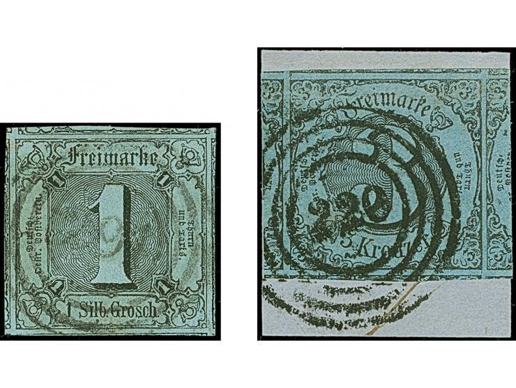 1 Silbergroschen auf graublau und 3 Kreuzer auf graublau, beide allseits überrandig mit Teilen aller 8 Nachbarmarken (sogenannte kleine 9er-Blocks), 1 Silbergroschen mit zentrischer Nr. "291" GERA, 3 Kreuzer mit Nr."220" FRANKFURT auf Briefstück; letztere leichte waagerechte Bugspur, sonst tadellos. Ein Ausnahmepärchen. Signiert bzw. Fotobefund Sem BPP.