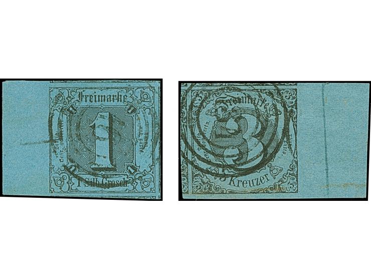 1 Silbergroschen auf graublau und 3 Kreuzer auf mittelgrünlichblau, beide überrandig mit Teilen aller Nachbarmarken und ca. 9,5 bzw. 14 mm Bogenrand, die 3 Kreuzer aus der rechten unteren Bogenecke stammend. 3 Kreuzer senkrechte Bugspur nur im Bogenrand, sonst tadellos. Ein ganz außergewöhnliches Paar. Fotobefund bzw.-Attest Sem BPP (2014 bzw. 1999)