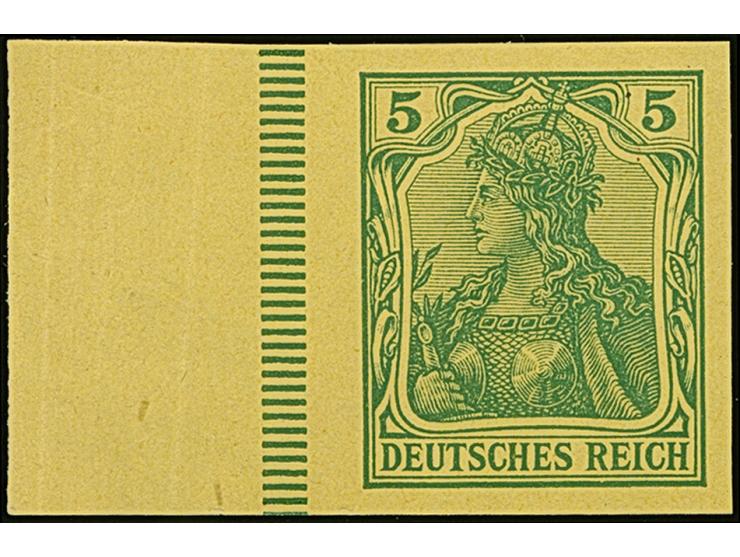 1902, Germania 5 Pfg. als ungezähnter Probedruck in Grün auf hellrötlichgelbem Papier ohne Gummierung, Randstück mit senkrechten Bügen im Rand, Marke in tadelloser Erhaltung, unsigniert mit Fotoattest Jäschke-L. BPP (2022)