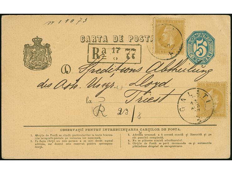 1877, GALATI 13.AUG.77 cds. in black on 5 b. postal stationery card used uprated with two 5 b. ochre, registration mark “Ra=17/77” in black and ms."R23/8" alongside, addressed to “Speditions Abteilung des Österr. Ungar. Lloyd in Triest”, transportet via Danube and black sea with Austrian ship, arrival mark TRIEST 16.8.77 on reverse, tiny border crease, otherwise fine and a very scarce registered usage