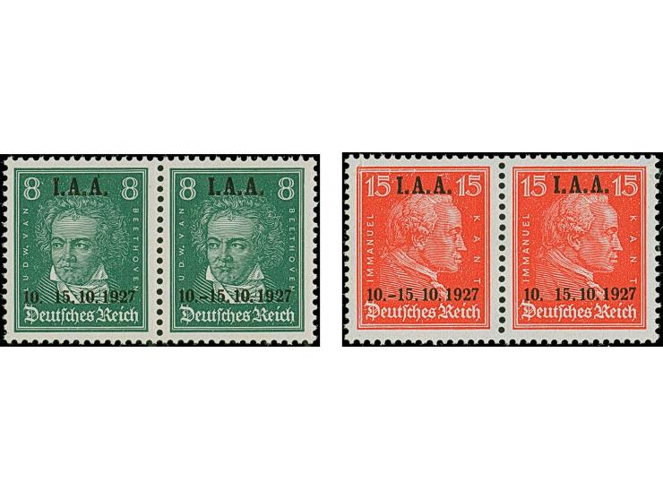 1927, I.A.A. 8 und 15 Pfg. je mit Aufdruck-Abart "Bindestrich zwischen 10 und 15 fehlt, jeweils im waagerechten Paar mit Normalmarke, postfrisch, in einwandfreier Erhaltung, unsigniert mit Fotoattest Oechsner BPP (2007) bzw. Schlegel BPP (1990)