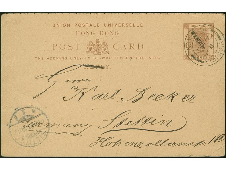 1901, 4 c. on 3 c. postal stationery reply portion of double card with inverted black surcharge (Yang P14 var.) cancelled VICTORIA HONG KONG AU/21/01. Addressed to Stettin Germany with arrival mark 20.9.01, tiny corner crease, otherwise fine. PROFI recorded only one normal card with inverted overprint, reply part inverted is unrecorded.