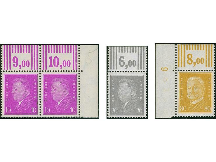 1930, Reichspräsidenten 10, 20 und 80 Pfg. mittelbraungelb jeweils mit Walzendruck-Oberrand mit der Konfiguration “3'7'3”, dabei die 10 Pfg. im waagerechten Eckrandpaar mit verschiedenen Konfigurationen, postfrisch, in einwandfreier Erhaltung, unsigniert, 80 Pfg Eckrandstück mit DZ “9” mit Fotobefund D. Schlegel BPP (2016)