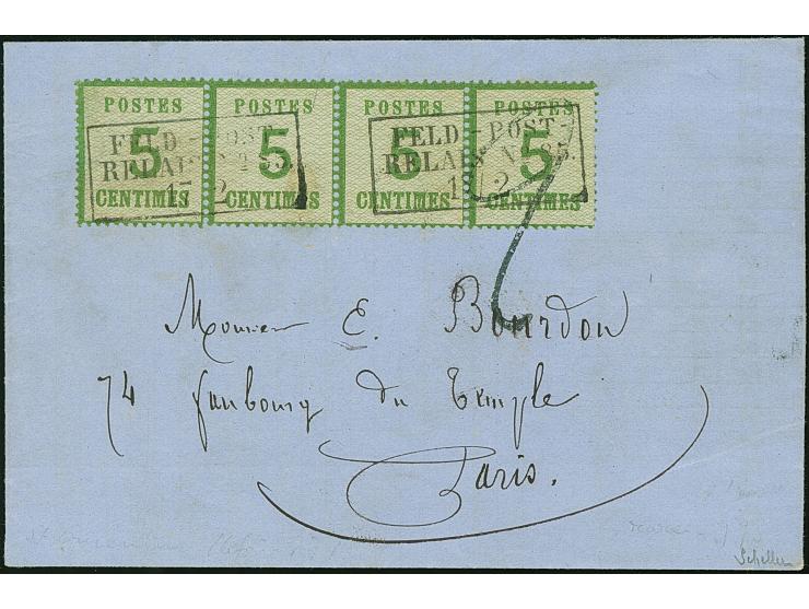 5 C. gelblichgrün, waagerechter 4-er Streifen, Spitzen nach oben, farbfrisch und gut gezähnt, entwertet durch Ra.3 "FELD-POST RELAIS N°85" 17/2" mit Taxziffer 2 (Décimes) auf Faltbrief nach Paris. Eine attraktive und seltene Frankatur in sehr guter Erhaltung, signiert Scheller