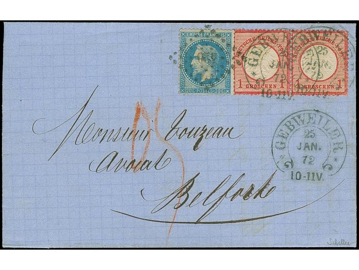 kleiner Schild 1 Gr. rotkarmin im waagerechten Paar, farbrisch, gut gezähnt und gut geprägt, sauber entwertet durch Hufeisenstempel “GEBWEILER 25 JAN. 72” (Spalink-Nr. 13) in Doppelfrankatur mit Frankreich Napoleon 20 C. blau mit PC “420” auf Faltbrief nach Belfort mit rückseitigem Ankunftsstempel, gute Erhaltung, signiert Scheller