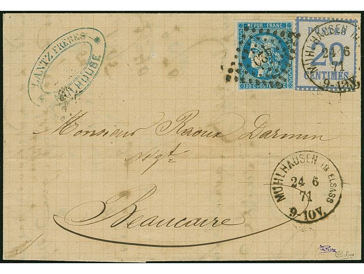 20 C. grauultramarin, Spitzen nach oben, entwertet durch EKr. “MULHAUSEN im ELSASS 24 6 71” in Mischfrankatur mit Frankreich Bordeaux 20 C. blau mit PC 420 (BELFORT) auf portogerechtem Faltbrief nach Beaucaire mit rückseitigem Ankunftsstempel, die Marke einige kurze Zähne, sonst in guter Erhaltung. Eine seltene Kombination mit der Bordeaux-Ausgabe, signiert sowie Fotoattest Calves (1988)