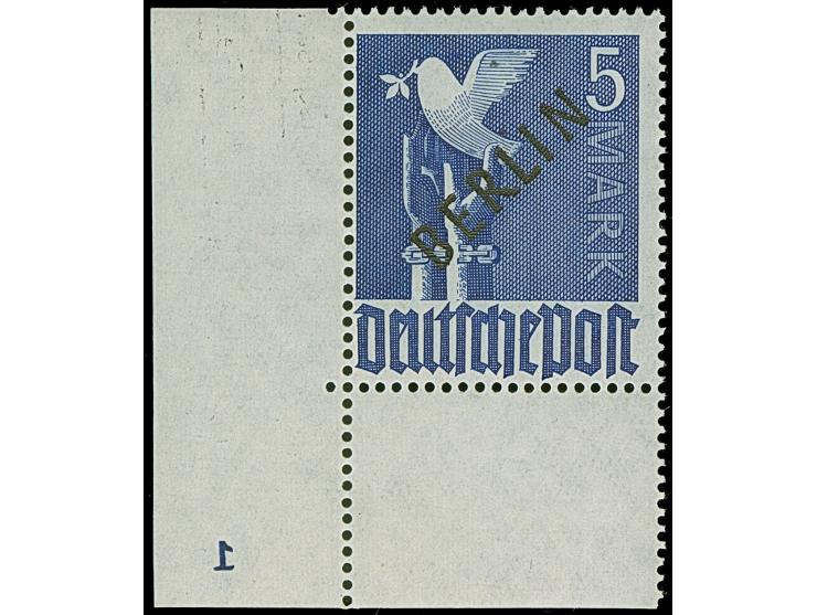 1948, Schwarzaufdruck 5 M. , linke untere Bogenecke mit Plattennummer "1" (spiegelverkehrt), postfrisch, kleine Falzspur im Unterrand, sonst einwandfrei. Fotoattest H.-D. Schlegel BPP (2025)