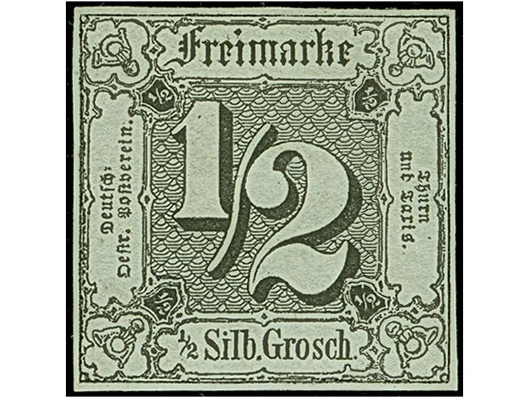 ½ Sgr. auf mattbläulichgrün, sehr schöne frische Farbe und allseits gleichmäßig breitrandig, ungebraucht mit Originalgummi. In dieser Erhaltung sehr selten. Fotoattest Sem BPP (2025)