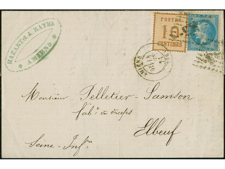 10 C. ockerbraun, Spitzen nach oben, in Doppelfrankatur mit Napoleon 20 C. blau, je entwertet durch GC “85” auf kompletter Faltbrief von Amiens nach Elbeuf mit rückseitigem Ankunftstempel “ELBEUF 17 MARS 71”, die 10 C. Marke wenige Zahnfehler, sonst in guter Erhaltung. Eine seltene Entwertung auf der Okkupationsausgabe