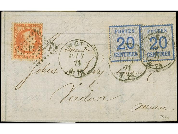 20 C. grauultramarine, Spitzen nach oben, zwei Stücke in Doppelfrankatur mit Napoleon 40 C. orange (minimal oxidiert) entwertet durch EKr. “METZ 16 () 71” bzw. Punktstempel auf vollständigem Faltbrief der 2. Gewichtsstufe nach Verdun und innen datiert “Metz le 16 mai 1871”, einige Zahnspitzen leicht getönt, sonst in sehr schöner Erhaltung, ein seltener Beleg, signiert Calves