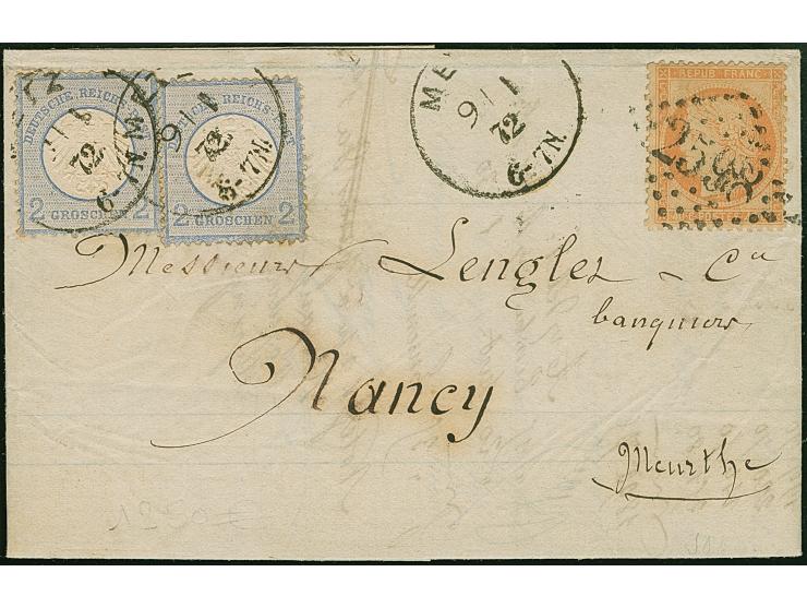 kleiner Schild 2 Gr. ultramarine, zwei Stücke, entwertet durch EKr. “METZ 9 1 72" in Doppelfrankatur mit Frankreich Cérès 40 C. orange mit PC “2598” (NANCY) auf vollständigem Faltbrief nach Nancy mit rückseitigem Ankunftsstempel, eine Brustschildmarke wenige Zahnverkürzungen, die andere gering getönt und etwas eckrund, eine frühe Doppelfrankatur in guter Erhaltung