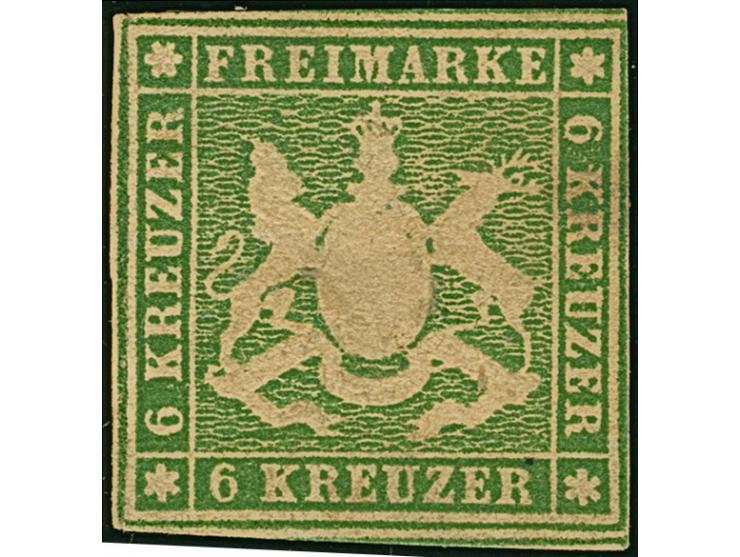 6 Kr. bläulichgrün, schöne tiefe Nuance, für diese Ausgabe sehr gut geschnitten, meist breitrandig, ungebraucht mit nicht originaler Gummierung. Die Marke ist etwas getönt und hat entlang der linken Randlinie eine Schwellung, sonst einwandfrei. Ein schönes Stück dieser ungebraucht äußerst seltenen Marke; PROFI hat kein weiteres ungebrauchtes Stück registriert. Fotoattest Irtenkauf BPP (2013)