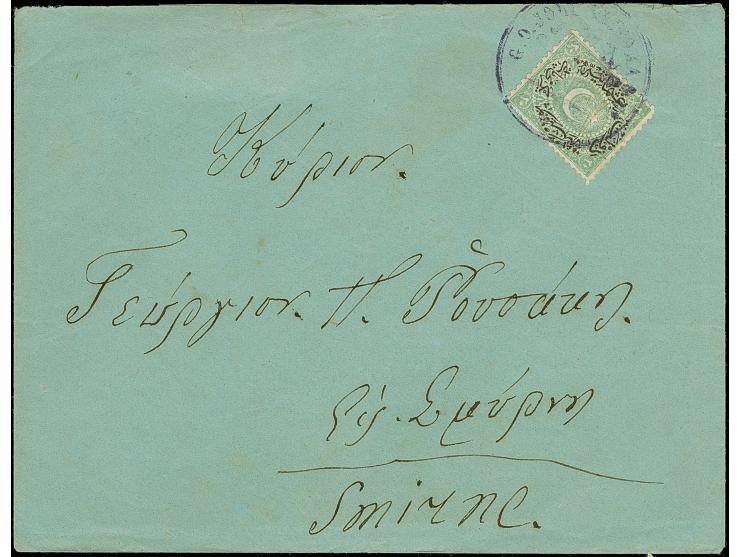 1883, “G.O. JOLY VICTORIA & CO / CHIO” violet circle cancellation on envelope from CHIO bearing Duloz 20 para green single, tiny vertical fold, scarce and attractive. In Profi archive only this Chio cancel on cover recorded.