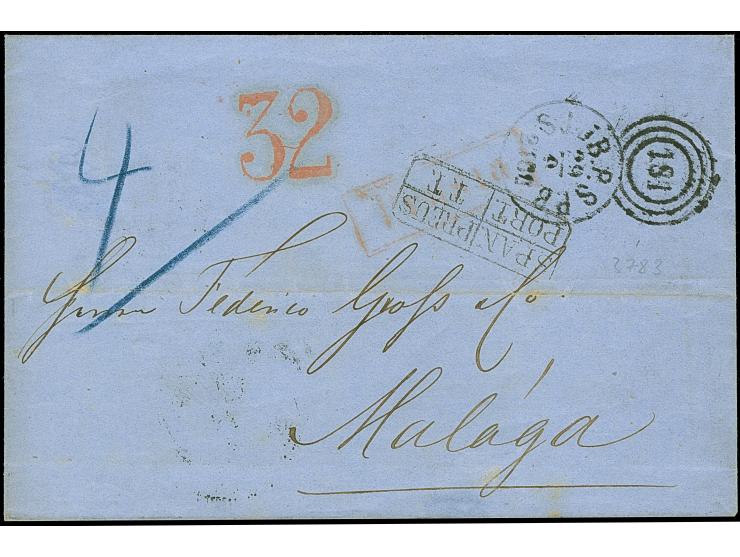 “SPAN./PREUS./PORT./T.T.”, Ra.2, sauber auf Briefhülle 1865 von Kopenhagen mit Duplex "181/S.J.JB.P.SP.B."nach Malaga