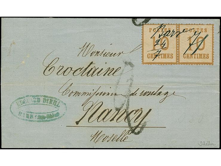 10 C. ockerbraun im waagerechten Paar, Spitzen nach oben, farbfrisch, sauber entwertet durch handschriftliche Entwertung “BARR 24/7 71” auf vollständigem, unterfrankiertem Faltbrief nach Nancy mit nebengesetztem Taxstempel “2” und rückseitigem Ankunftstempel, die Marke mit einigen Zahnverkürzungen, sonst in sehr schöner Erhaltung, signiert Scheller. Selten