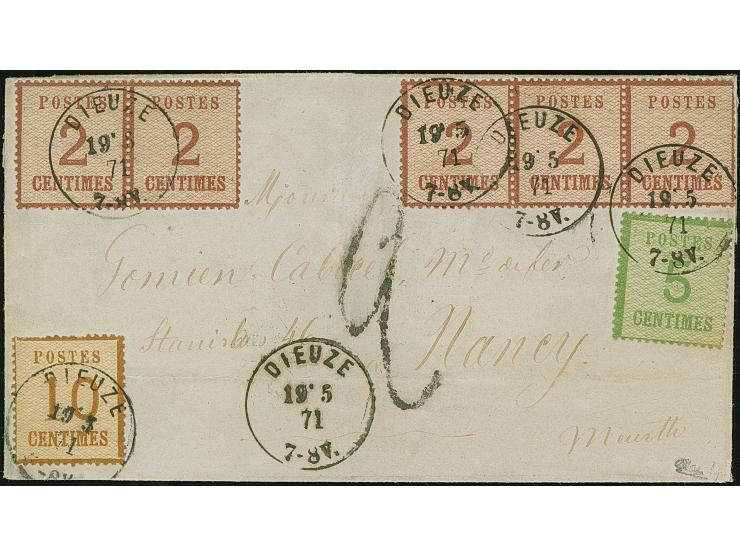 2 C. rotbraun im waagerechten 3er-Streifen und Paar, sowie 5 C. grün und 10 C. ocker braun, farbfrisch, sauber entwertet durch EKr. “DIEUZE 19 5 71” auf Brief nach Nancy mit rückseitigem Ankunftstempel “METZ 19 MAi 71”, zusätzlich taxiert mit “2” Décimes. Die 10 C. Marke mit senkrechter Faltung, einige Marken in der Zähnung teils leicht bestoßen, sonst in schöner Erhaltung. Eine außergewöhnlich seltene Buntfrankatur, signiert Calves sowie Fotoattest Scheller (2025)