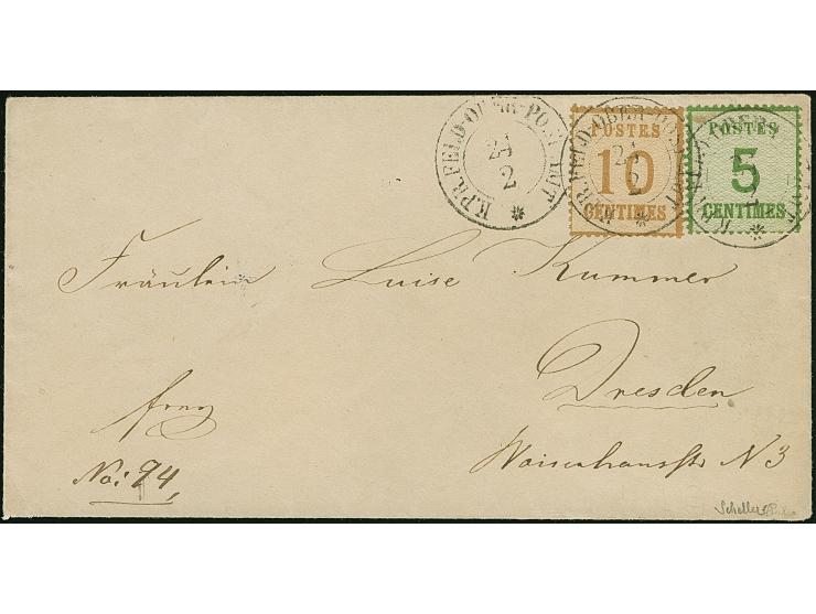 “K. PR. FELD-OBER-POST AMT 24 2 *”, sauber auf- sowie nebengesetztem auf 5 C. grün und 10 C. ockerbraun auf Briefkuvert nach Dresden mit rückseitigem Ankunftstempel. Eine sehr seltene Kombination mit diesem Stempel, in Versailles verwendet, signiert Calves und Scheller