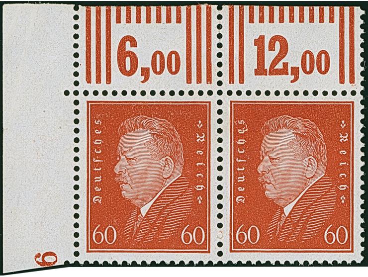 1928, Reichspräsidenten 60 Pfg. im waagerechten Paar aus der linken oberen Bogenecke mit Walzendruck-Konfiguration “3'7'3 + 2'9'2”. Die Oberränder sind oben leicht schräg beschnitten und der linke Bogenrand mit Gummifehler, die postfrischen Marken sind in tadelloser Erhaltung. Marken dieser Wertstufe mit Walzendruck-Oberrand vom Feld 1 sind selten, unsigniert mit Fotoattest D. Schlegel BPP (2025)