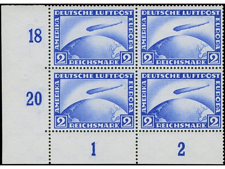 1928, Zeppelin 2 und 4 M. jeweils im Viererblock aus der linken unteren Bogenecke, postfrisch, in tadelloser Erhaltung, unsigniert mit Fotoattest D. Schlegel BPP (2025)