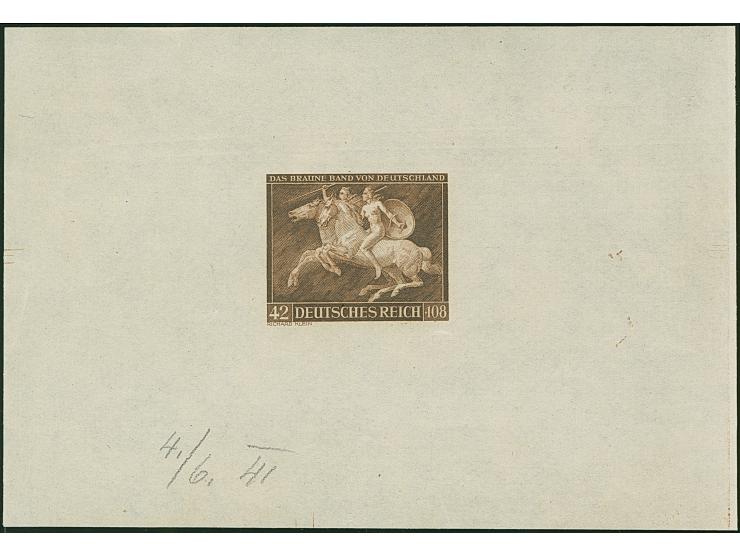 1941, Braunes Band 42 Pfg. als ungezähnter Probedruck in den Originalfarben, als Einzelabzug auf weißem Papier im Blockformat (120 x 82 mm) mit Bleistiftvermerk “4./6. 41". Der postfrische Probedruck hat einen Gummifehler, ansonsten in einwandfreier Erhaltung, signiert Ludin BPP und Fotobefund D. Schlegel BPP (2015)