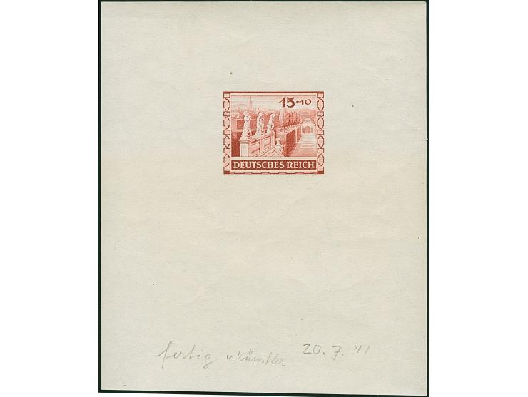 1941, Wiener Messe 15 Pfg. als ungezähnter Probedruck in Braunrot als Einzelabzug im Blockformat (95 x 115 mm) mit Bleistiftvermerk “fertig v. Künstler 20.7.41”, postfrisch mit leichten Gummibügen. In dieser Form selten, Fotobefund D. Schlegel BPP (2018)