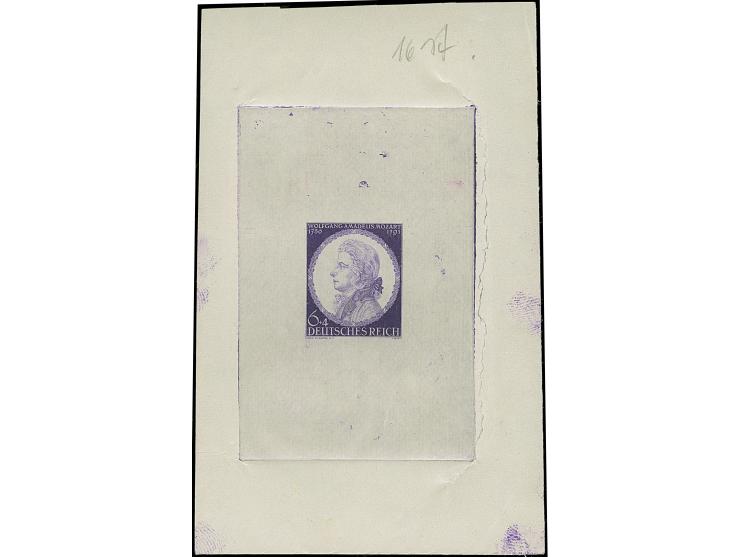 1941, Mozart 6 Pfg. als ungezähnter Probedruck in Schwärzlichviolett als Einzelabzug im Blockformat (88 x 139 mm), postfrisch, rechts im Rand neben dem Urstempel gebrochen, ansonsten in guter Erhaltung. In dieser Variante selten