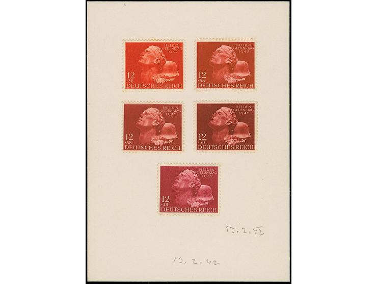 1942, Heldengedenktag 12 Pfg. als Farb-Probedruck mit Linienzähnung, fünf Proben in verschiedenen Rottönen auf Vorlagekarton mit Bleistiftdatierung vom 13.2.42, in einwandfreier Erhaltung. In dieser Kombination äußerst selten, ProFi hat nur ein weiteres Exemplar in dieser Art registriert, Fotoattest D. Schlegel BPP (2023)