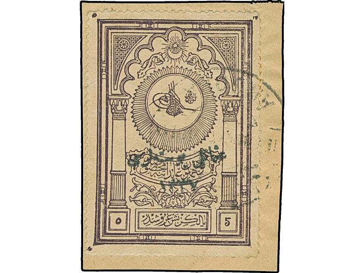 1921, Museum 5 pia. dull violet 1337 handstamped, tied by 'ANGORA' cds. to piece, not cut and very fine. Important rarity of Turkey in Asia issues. Certificates du Vachat BPP (2000) and P. Behr (2009). (Isfila catalogue value 9.000,-€) In PROFI archive no other used ‘Violet Museum’ on piece recorded.