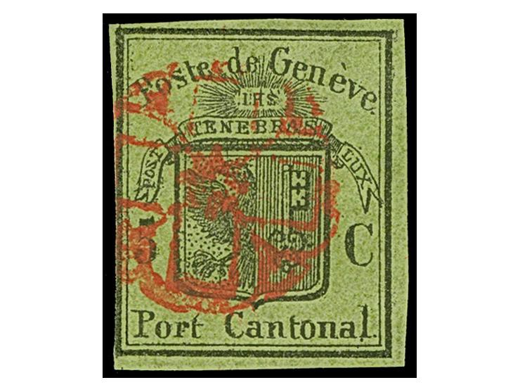 1846, Großer Adler 5 C. auf lebhaftgelboliv, farbfrisch, links teils mit der Randlinie geschnitten, sonst breitrandig, sauber entwertet durch rote Rosette. Einwandfrei. Attest Rellstab (1977)