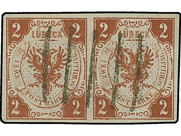 2 Sch. rötlichbraun im waagerechten Paar, farbfrisch und allseits breitrandig, sehr schön entwertet durch vollständig mittig aufgesetzten Strichstempel. Die rechte Marke unauffälliger kleiner Federmesserschnitt im Markenbild, sonst einwandfrei. Ein besonders attraktives und seltenes Paar. Signiert u.a. Grobe, Fotobefund Mehlmann BPP (2017)