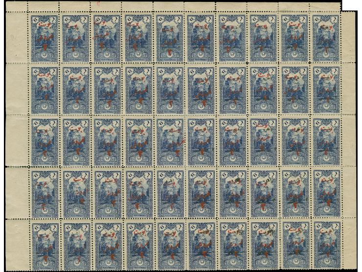 1920, 3 pia. on 6 pa. deep blue, red handstamped block of 50 with margins on three sides, most mint never hinged and very fine, some perfs and 3rd row apart, large blocks of this issue are very scarce. (Isf. catalogue value for mh blocks 12.700,-€). PROFI archive has not recorded larger blocks than four, an important rarity of Turkey in Asia issues.
