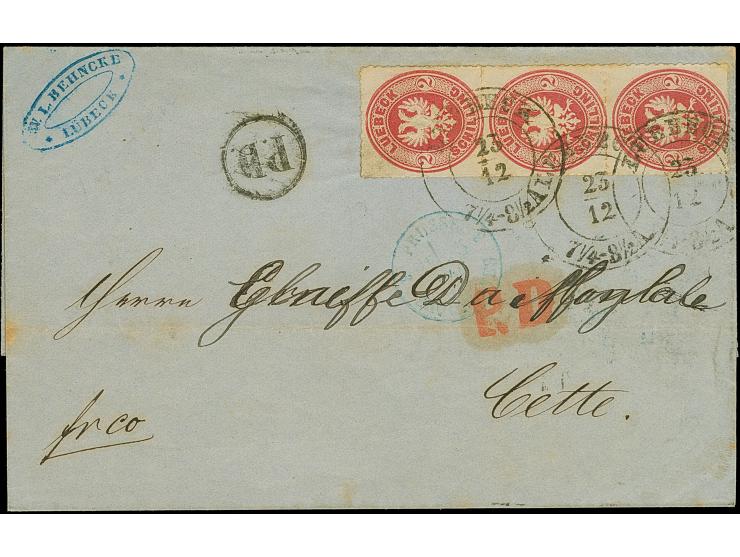 2 Sch. karmin im senkrechten 3er-Streifen, farbfrisch und gut durchstochen mit sauber aufgesetztem Doppelkreisstempel "LUEBECK 23/12" (1867) auf Briefhülle nach Cette, Frankreich mit Transit- und Ankunftsstempeln. Leichte Altersspuren, sonst einwandfreie und ursprüngliche Erhaltung, lediglich der Name in der Adresse abgeändert. Ein attraktiver und außerordentlich seltener Auslandsbrief. Größte registrierte Einheit dieser Marke auf Brief; PROFI hat nur einen weiteren registriert. Fotoattest Brettl BPP (2002)