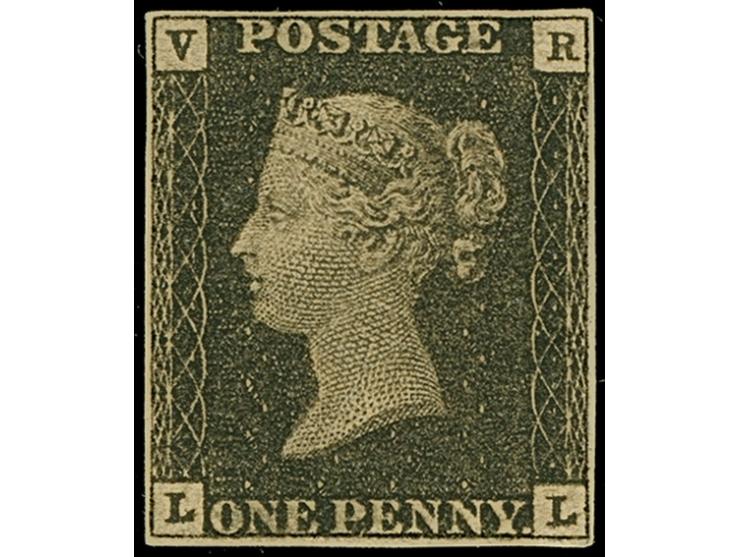OFFICIALS: 1840, Unissued "VR" 1 d. black, LL, small but regular margins all around, unused without gum, slightly toned, otherwise in good and fresh quality. According to Mr. Louis, “It is possible that the stamp was used by Rowland Hill for cancellation removal trials carried out in June 1840. The stamps were coated with unknown substances, then cancelled, and finally treated chemically to remove or wash off the obliteration. The chemical process might have caused the toning of the paper. Stamps from the horizontal “L” row are recorded having been used for those trials." Certificate Louis BPP (2025)