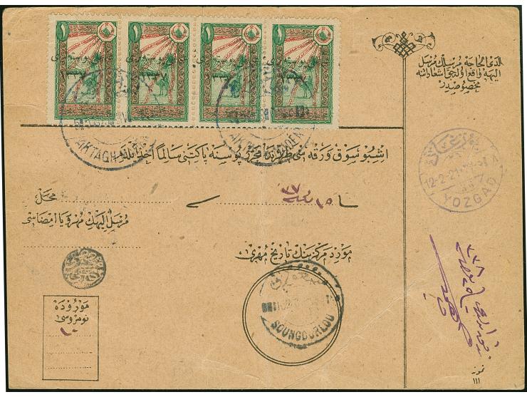 1921, Hejaz railway 1 Pia. green carmine typo overprint 1337, strip of four tied on reverse of parcel card with additional franking on front by 'AKTAGH-MADENI 5.5.21' cds., usual parcel cuts, very fresh and scarce.
