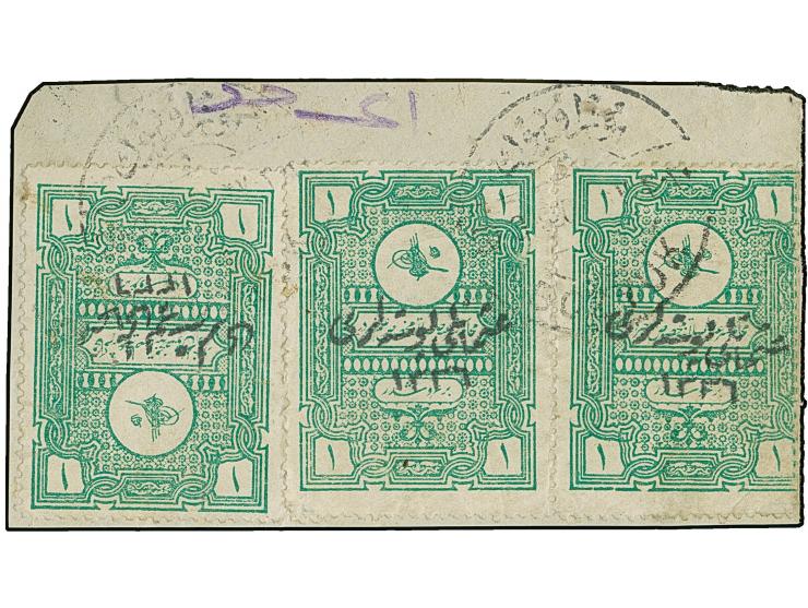 1920, Religious Tribunals Fiscal pair and single 1 pia. emerald, all tied by ‘BOZYÜK 10.3.21’ cds. to piece, no cuts, fine and a scarce usage from the later bombed P.O. Bozyük during Turkish civil war. (Isfila cat. value 3.600,-€)
