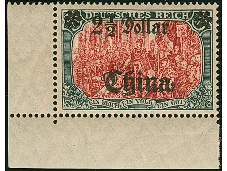 1906/19, 2½ Dollar auf 5 M. Friedensdruck, Zähnungslöcher 26:17, Wertaufdruck nach links mit lackartig glänzendem Aufdruck mit Abstand 9,5 mm aus der linken unteren Bogenecke, postfrisch und in tadelloser Erhaltung. Die farbfrische Marke ist in dieser Variante außerordentlich selten, ProFi hat kein weiteres postfrisches Exemplar registriert, unsigniert mit Fotoattest Jäschke-L. BPP (2017)