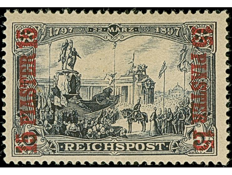 Amtlich nicht ausgegeben: 1902, 15 Pia. auf 3 M. in Type I, mit Aufdrucktype II (A oben mit Serifen), ungebraucht und in einwandfreier Erhaltung. Ein schönes Exemplar dieser äußerst seltenen Marke mit Fotoattest R. Steuer VÖB (2001)