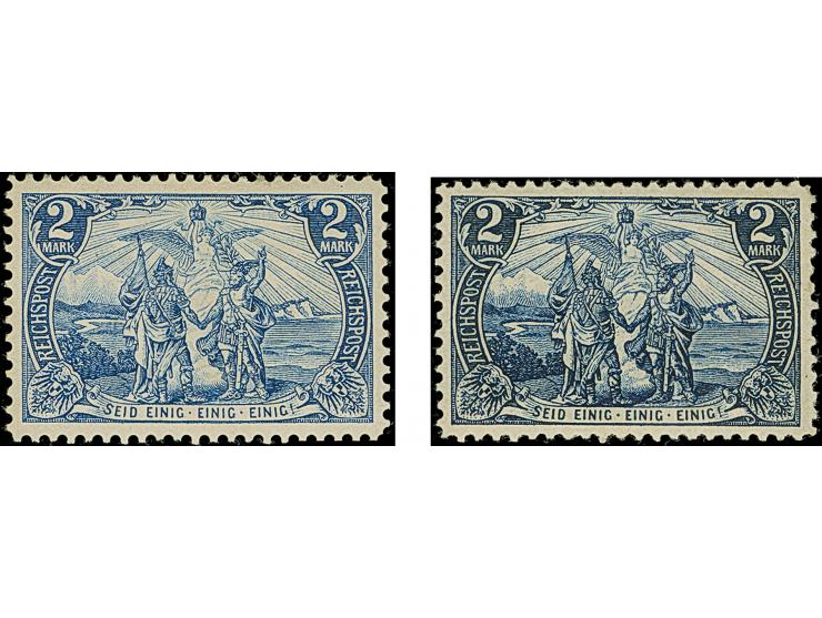 Versuchsdrucke mit Linienzähnung 11½: 1900, Reichspost 2 M. in Type I und II (dunkle Farbnuance), sind farbfrisch und sehr gut gezähnt bzw. normal gezähnt. Beide ungebrauchte Marken haben kleine Ausbesserungen sowie ein Wert mit hellem Zahn, ansonsten optisch in sehr ansprechender Erhaltung. Ein dekoratives “Paar” mit beiden Typen, signiert Köhler bzw. doppelt signiert Dr. Wittmann sowie zwei Fotoatteste Jäschke-L. BPP (2025)