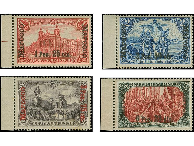 Amtlich nicht verausgabt: 3 C. auf 3 Pfg. bis 6 Pes. 25 cts. auf 5 M. “Deutsches Reich” ohne Wasserzeichen mit Aufdruck der Ausgabe von 1900 komplett, dabei die Höchstwerte je mit Bogenrand. Die farbfrischen, ungebrauchten Marken haben zum Teil leichte Stockpunkte bzw. leichte Zahnfehler (3 Pes. 75 Cts. auf 3 M. mit winzigen Schürfstellen vorderseitig), ansonsten in guter Erhaltung. Komplette Sätze dieser Aufdruck-Essay-Ausgabe sind außerordentlich selten, ProFi hat nur einen weiteren Satz registriert. Die Marken sind signiert Willmann bzw. Kosack und Bleistiftsignatur Sergio Sismondo mit Fotoattest (2005) sowie Fotoattest Jäschke-L. BPP (2025)