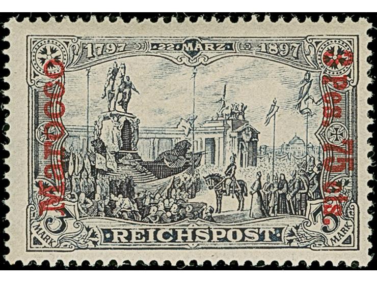 1903, 3 Pes. 75 cts. auf 3 M. in Type II mit fettem Aufdruck, die farbfrische und sehr gut gezähnte Marke ist ungebraucht und in tadelloser Erhaltung. Diese Variante ist in ungebrauchter Erhaltung selten, signiert Dietrich und Fotoattest Jäschke-L. BPP (2025)
