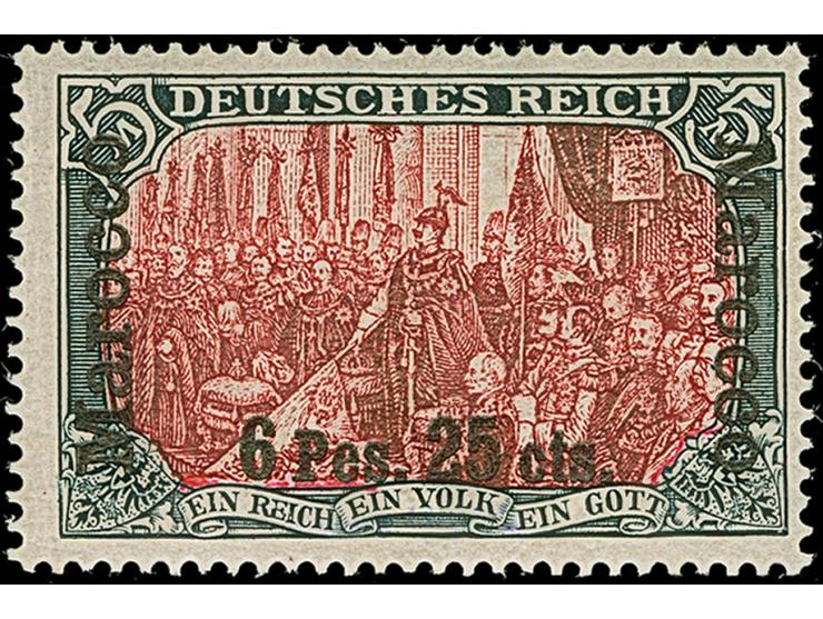 Amtlich nicht ausgegeben: 6 Pes. 25 cts auf 5 M. Zwischentype (Mittelstück Böttcher mit Ohr), ungebraucht mit leichter Verfärbung des Mittelstücks, ansonsten sehr gut gezähnt und in einwandfreier Erhaltung. Von diesen Essais wurden nur wenige Exemplare hergestellt, signiert v.Willmann und Kosack sowie Fotoattest Jäschke-L. BPP (2025)